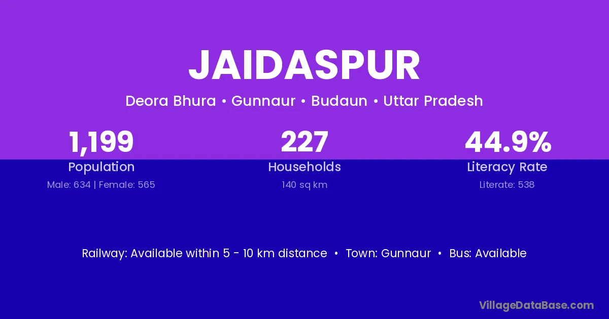 Jaidaspur village has a total population of 1,199 people, of which 634 are males and 565 are females.
