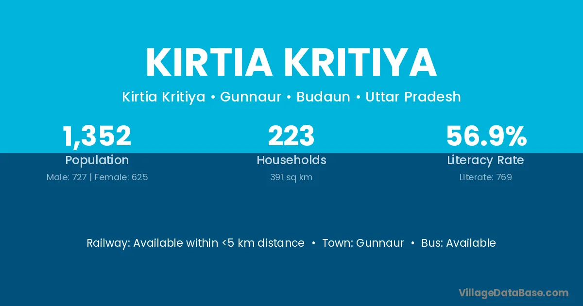 Kirtia Kritiya village has a total population of 1,352 people, of which 727 are males and 625 are females.