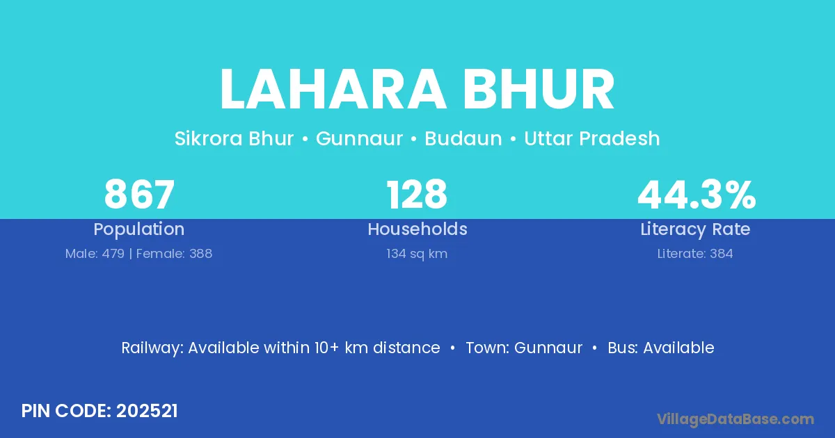 Lahara Bhur village has a total population of 867 people, of which 479 are males and 388 are females.