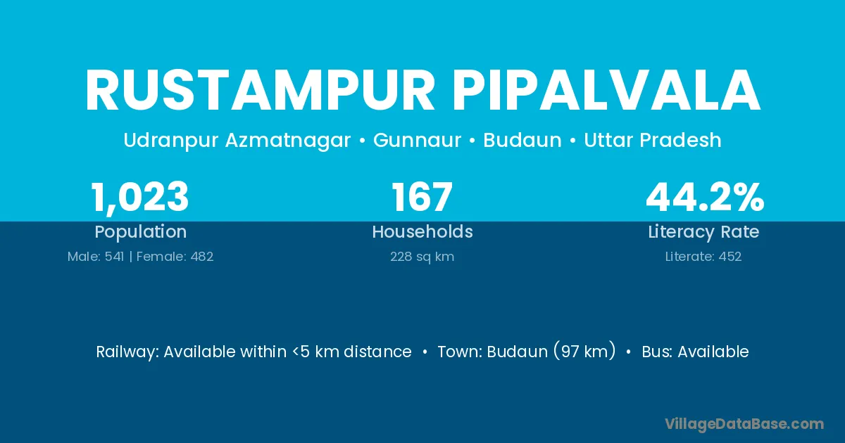 Budaun (97 km) is the nearest town to Rustampur Pipalvala village for major economic activities and is located approximately 97 km away.