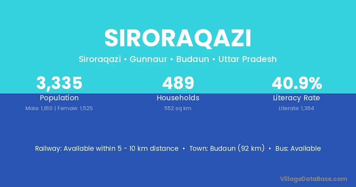 Budaun (92 km) is the nearest town to Siroraqazi village for major economic activities and is located approximately 92 km away.