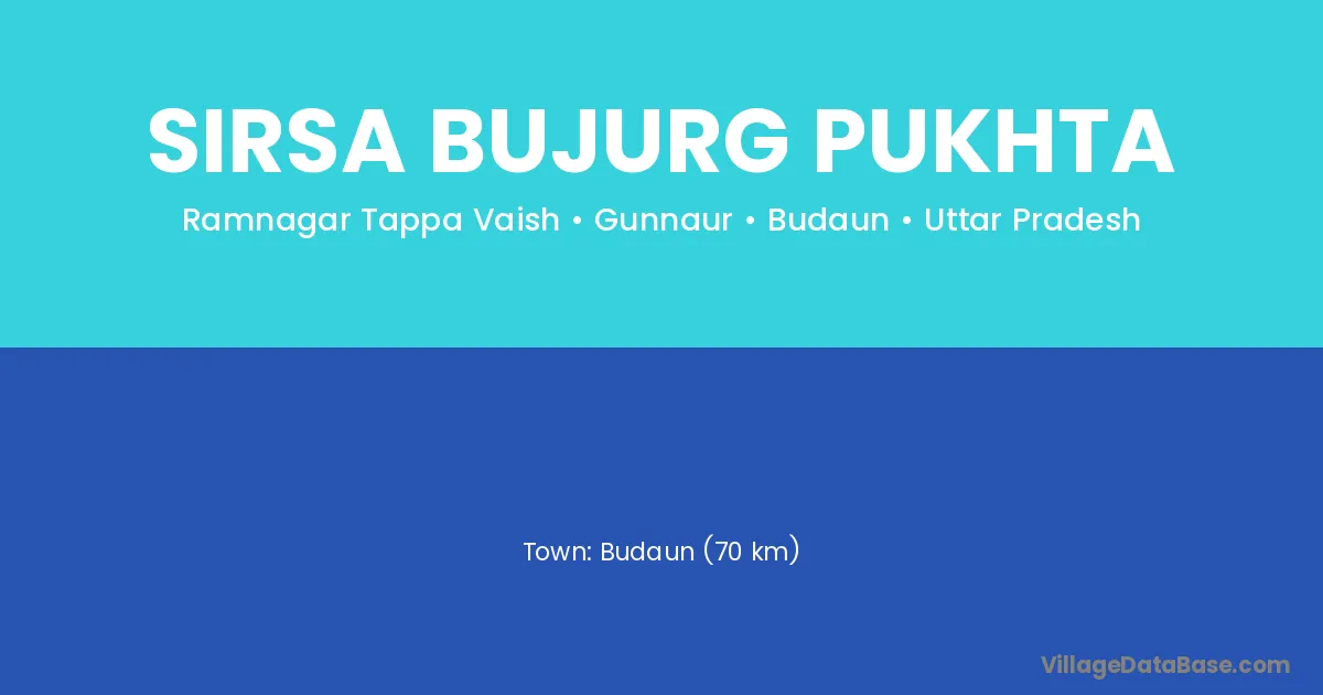 Budaun (70 km) is the nearest town to Sirsa Bujurg Pukhta village for major economic activities and is located approximately 70 km away.