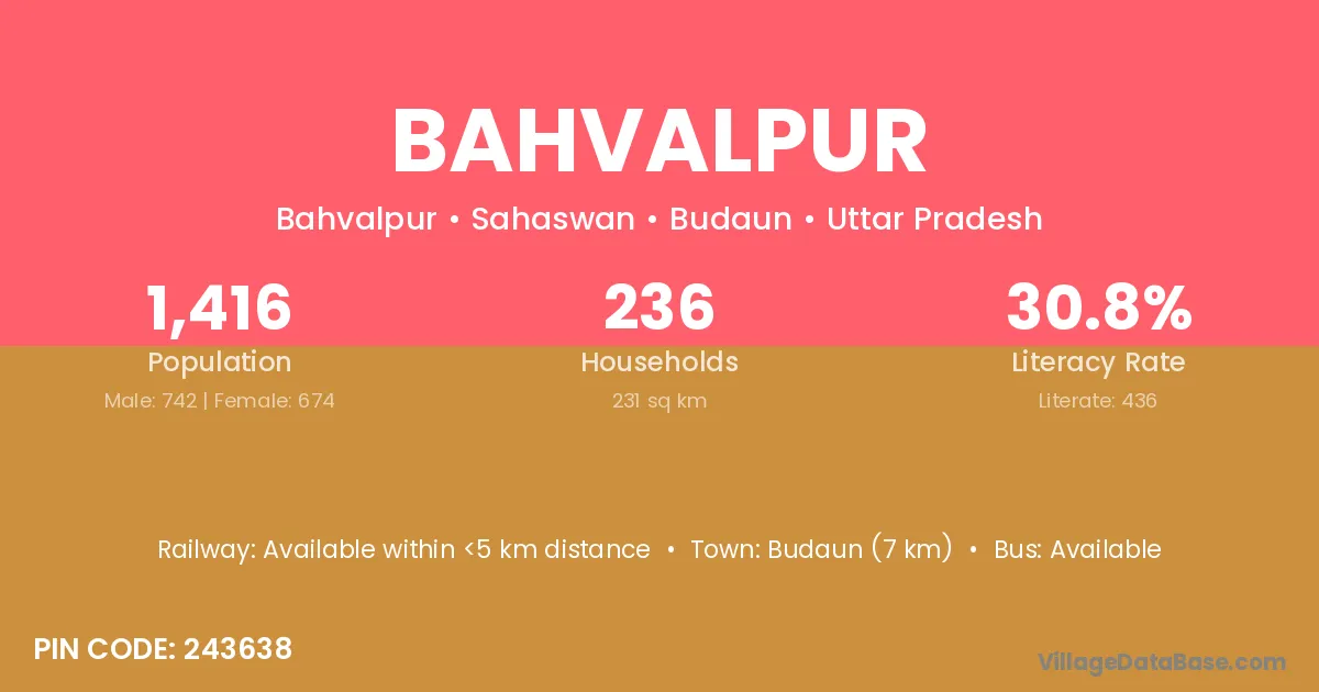 Budaun (7 km) is the nearest town to Bahvalpur village for major economic activities and is located approximately 7 km away.