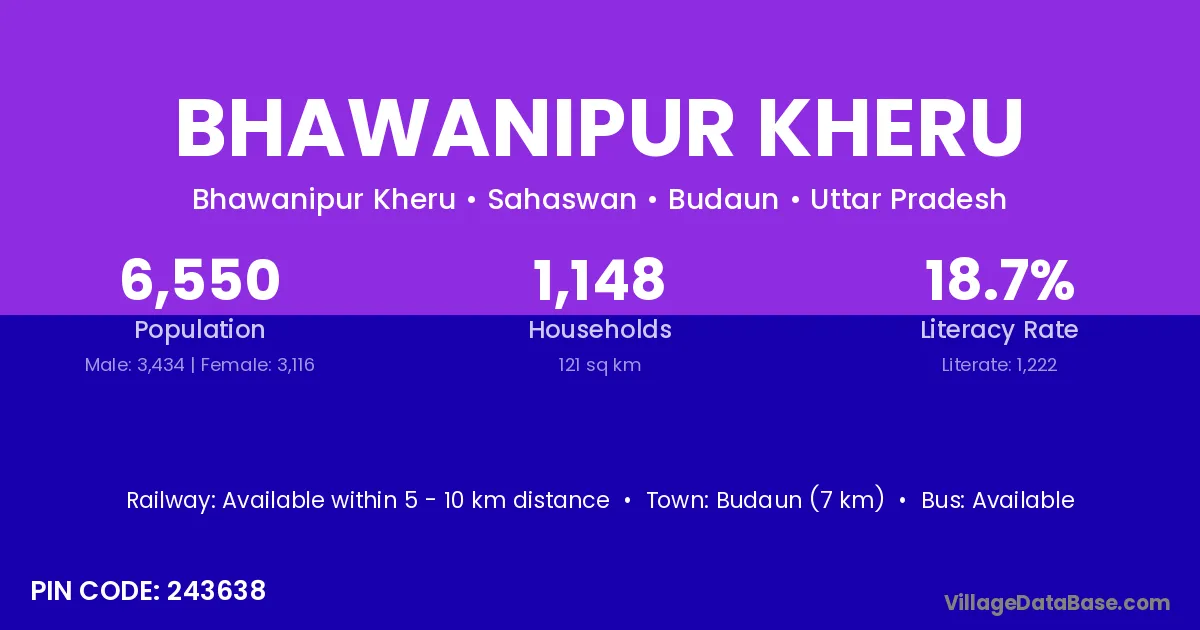 Budaun (7 km) is the nearest town to Bhawanipur Kheru village for major economic activities and is located approximately 7 km away.