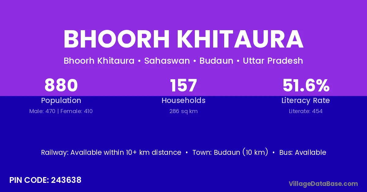 Budaun (10 km) is the nearest town to Bhoorh Khitaura village for major economic activities and is located approximately 10 km away.