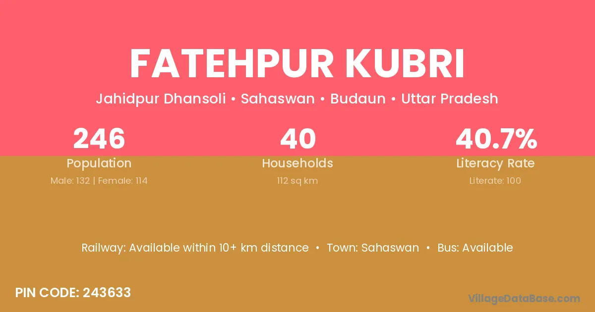 Fatehpur Kubri village has a total population of 246 people, of which 132 are males and 114 are females.