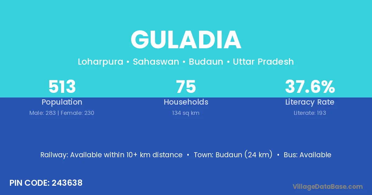 Budaun (24 km) is the nearest town to Guladia village for major economic activities and is located approximately 24 km away.
