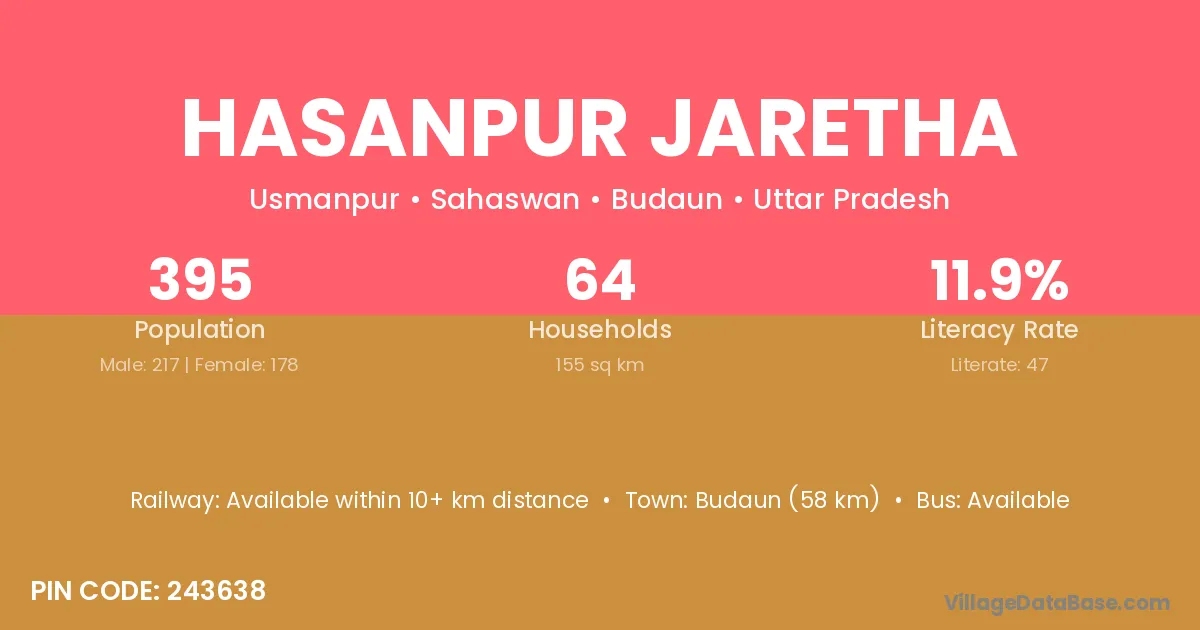 Budaun (58 km) is the nearest town to Hasanpur Jaretha village for major economic activities and is located approximately 58 km away.