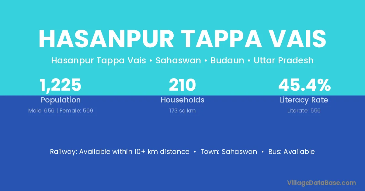 Hasanpur Tappa Vais village has a total population of 1,225 people, of which 656 are males and 569 are females.