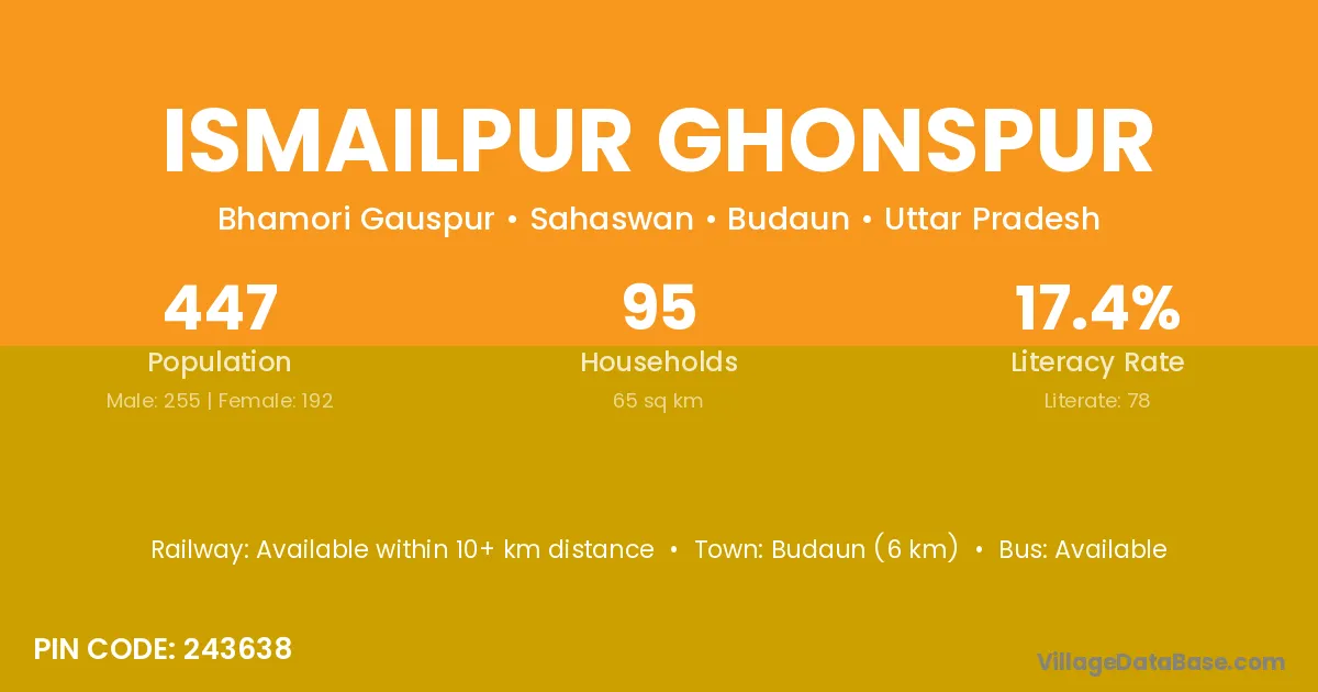 Budaun (6 km) is the nearest town to Ismailpur Ghonspur village for major economic activities and is located approximately 6 km away.