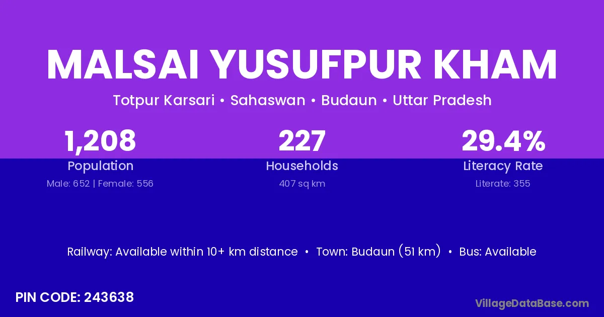 According to Census 2011 information, the village code of Malsai Yusufpur Kham village is 243638.