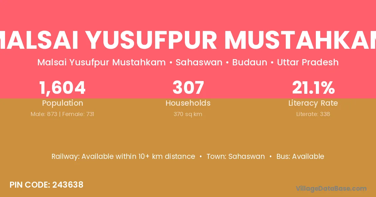 Malsai Yusufpur Mustahkam village has a total population of 1,604 people, of which 873 are males and 731 are females.