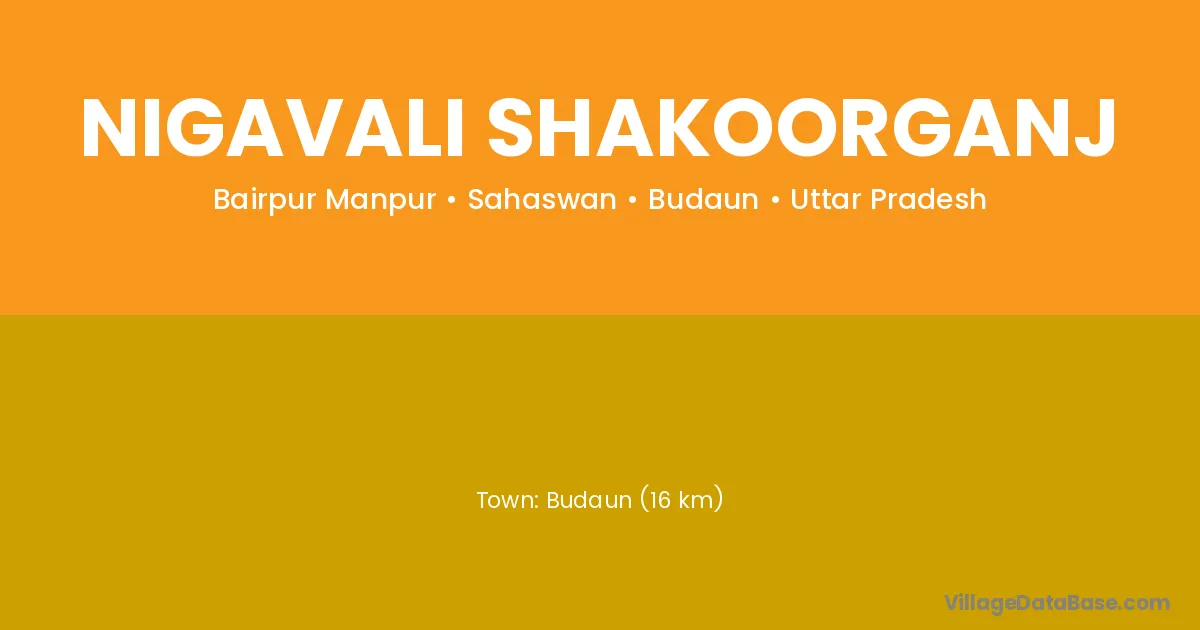 Budaun (16 km) is the nearest town to Nigavali Shakoorganj village for major economic activities and is located approximately 16 km away.