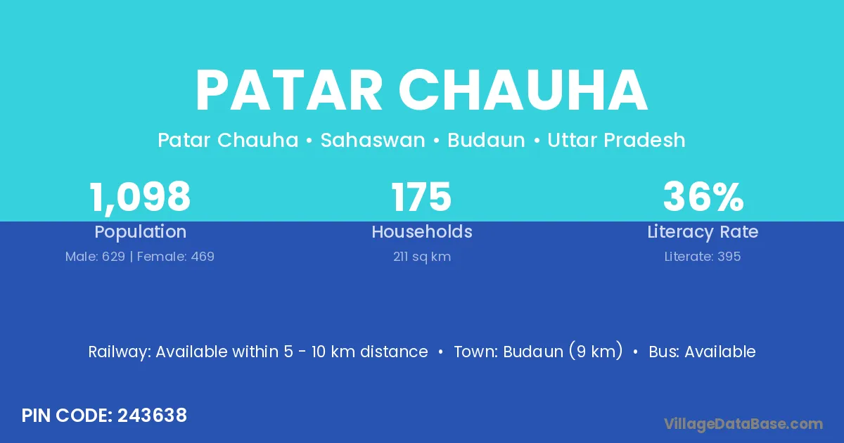 Budaun (9 km) is the nearest town to Patar Chauha village for major economic activities and is located approximately 9 km away.