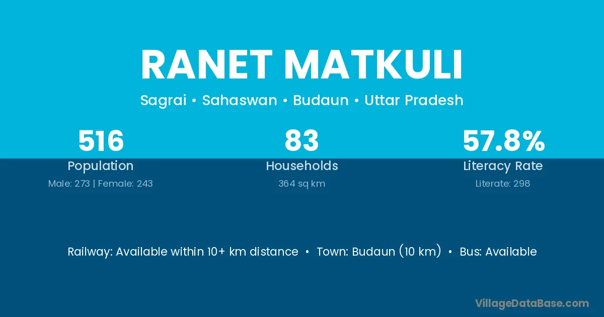 Budaun (10 km) is the nearest town to Ranet Matkuli village for major economic activities and is located approximately 10 km away.