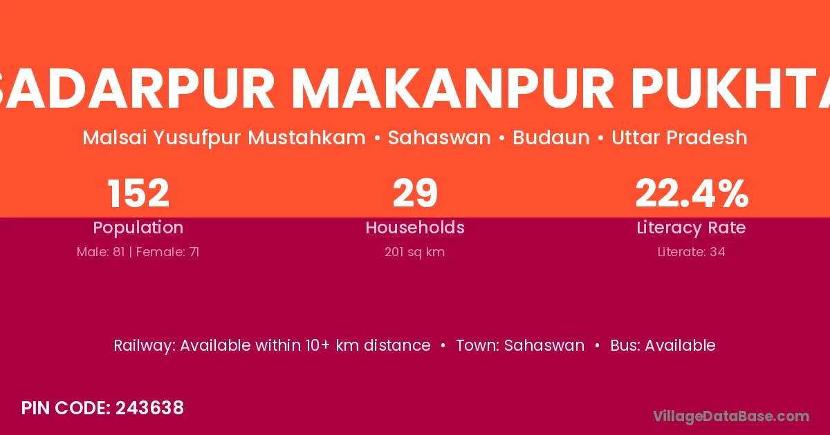 Sadarpur Makanpur Pukhta village has a total population of 152 people, of which 81 are males and 71 are females.