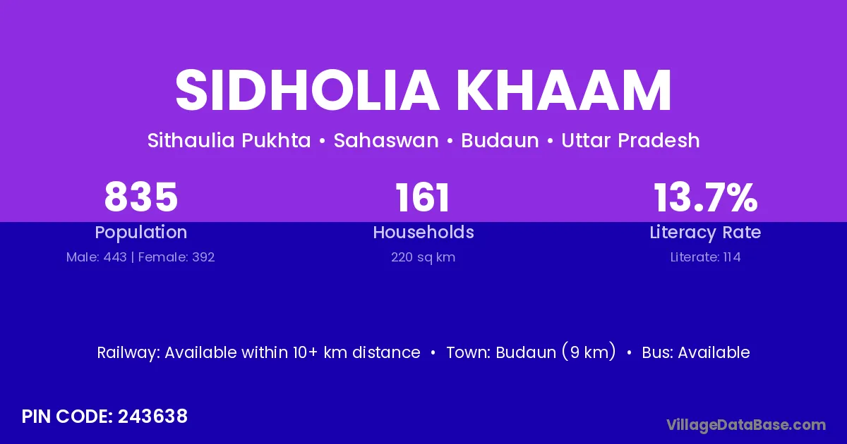 Budaun (9 km) is the nearest town to Sidholia Khaam village for major economic activities and is located approximately 9 km away.