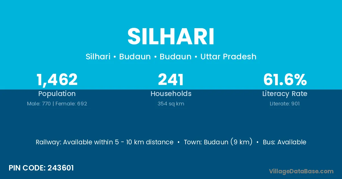 Budaun (46 km) is the nearest town to Silhari village for major economic activities and is located approximately 46 km away.