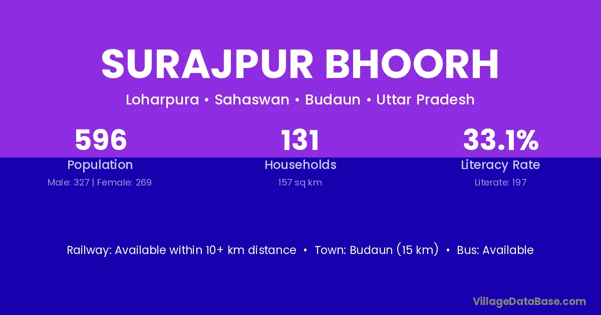 Budaun (15 km) is the nearest town to Surajpur Bhoorh village for major economic activities and is located approximately 15 km away.