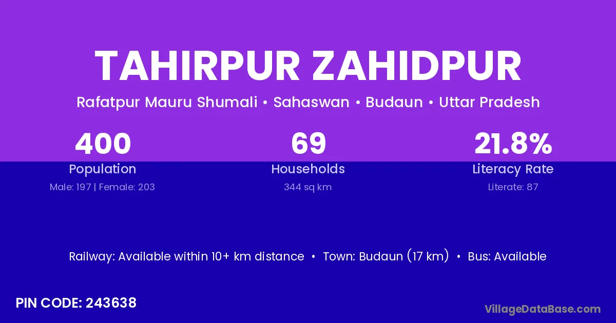 Budaun (17 km) is the nearest town to Tahirpur Zahidpur village for major economic activities and is located approximately 17 km away.