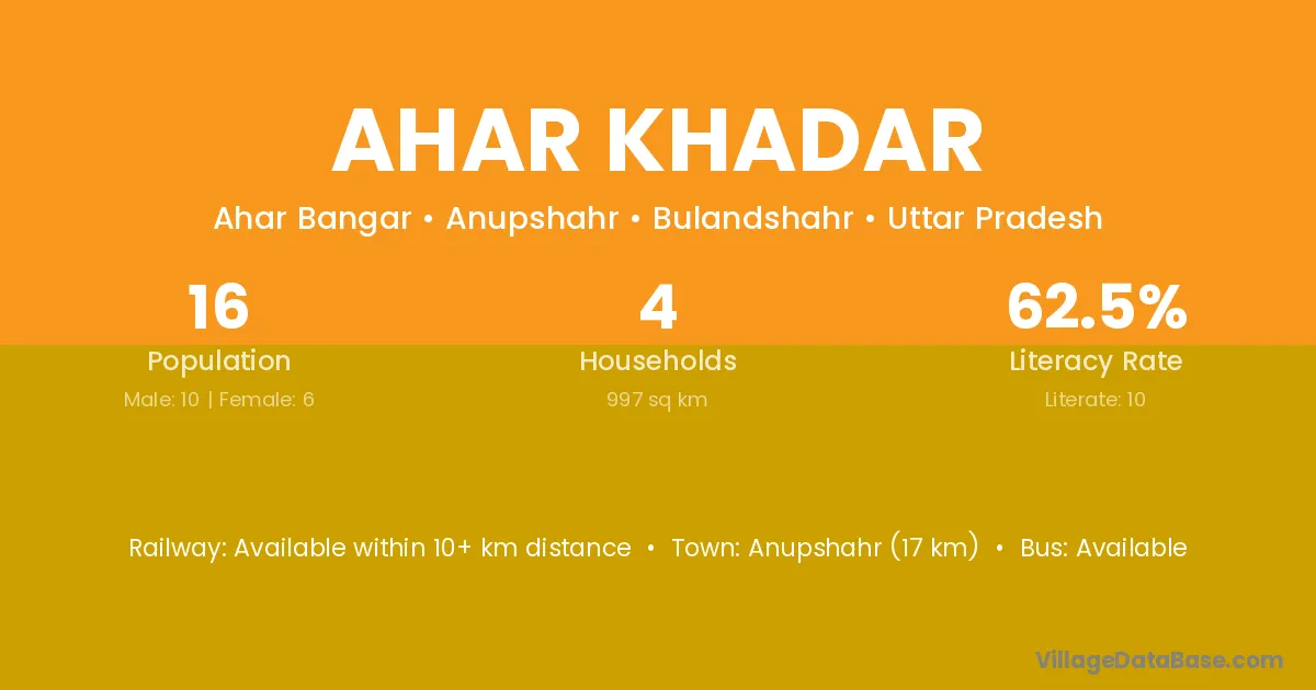 Anupshahr (17 km) is the nearest town to Ahar Khadar village for major economic activities and is located approximately 17 km away.