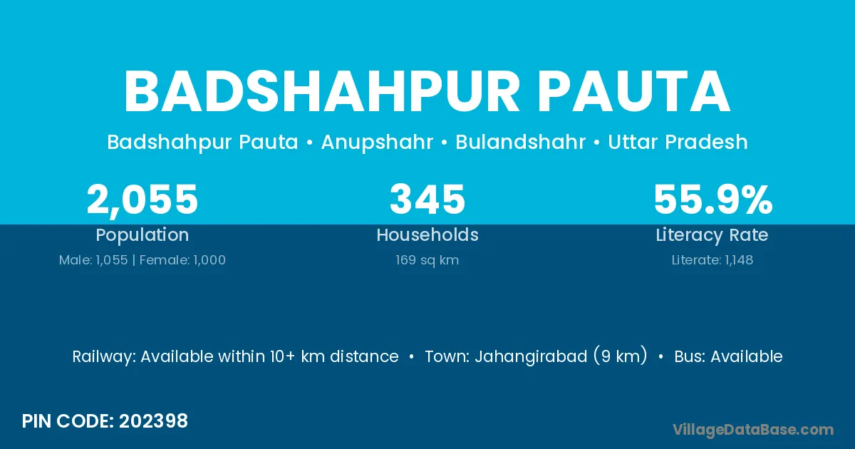 Jahangirabad (9 km) is the nearest town to Badshahpur Pauta village for major economic activities and is located approximately 9 km away.
