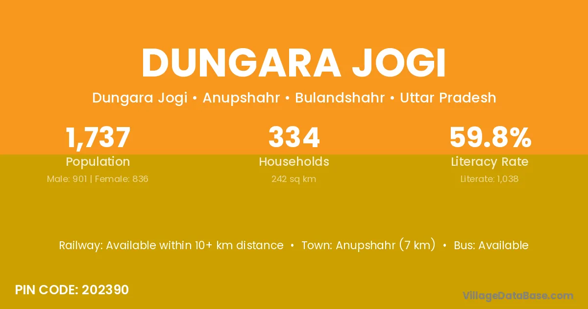 Anupshahr (7 km) is the nearest town to Dungara Jogi village for major economic activities and is located approximately 7 km away.
