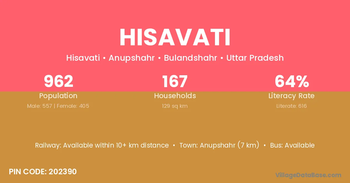 Anupshahr (7 km) is the nearest town to Hisavati village for major economic activities and is located approximately 7 km away.