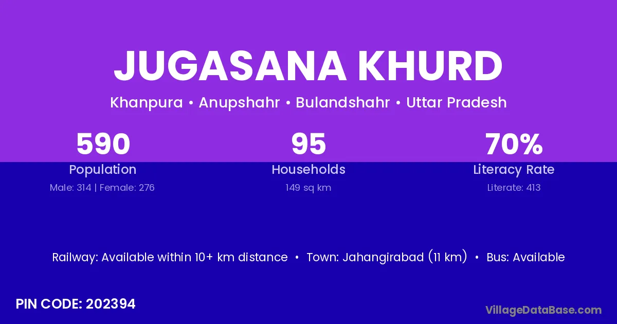 Jahangirabad (11 km) is the nearest town to Jugasana Khurd village for major economic activities and is located approximately 11 km away.