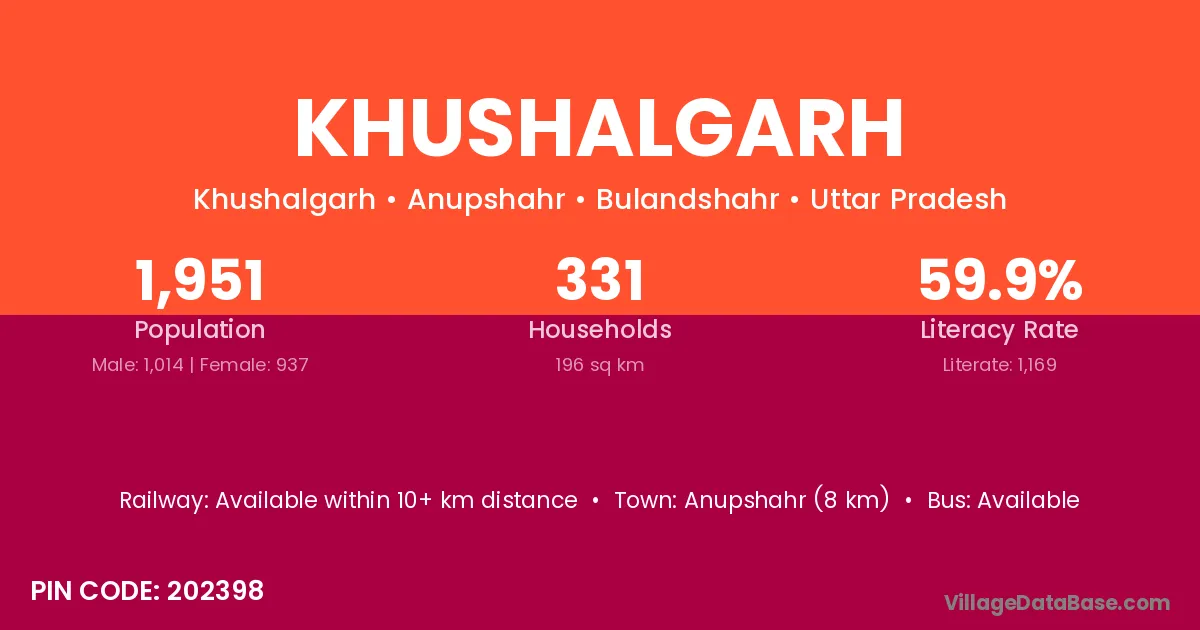 Anupshahr (8 km) is the nearest town to Khushalgarh village for major economic activities and is located approximately 8 km away.