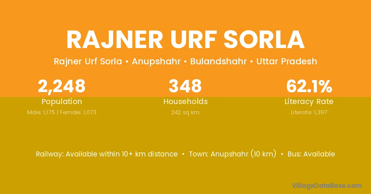 Anupshahr (10 km) is the nearest town to Rajner Urf Sorla village for major economic activities and is located approximately 10 km away.