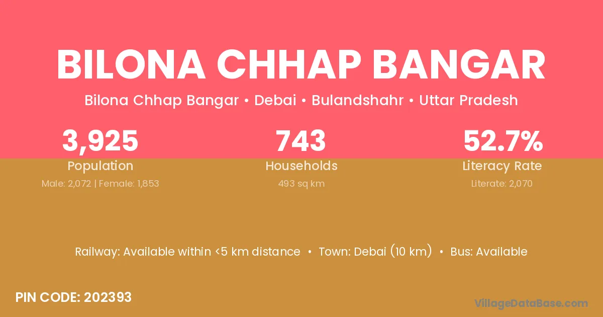 Bilona Chhap Bangar village has a total population of 3,925 people, of which 2,072 are males and 1,853 are females.