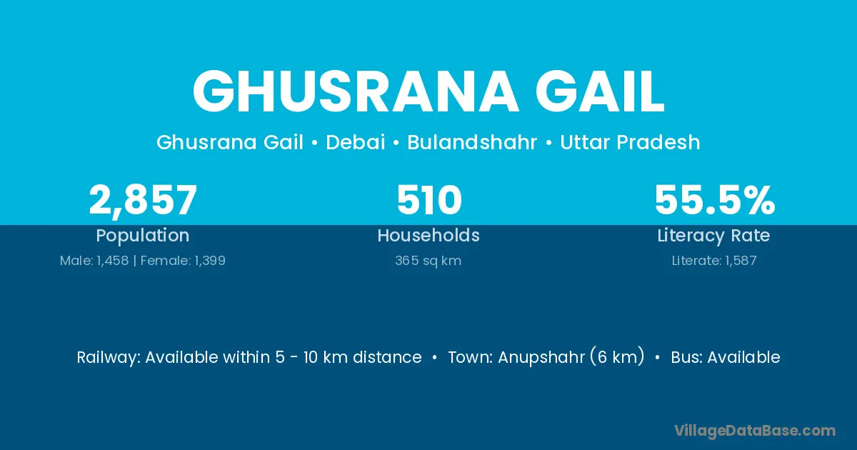 Anupshahr (6 km) is the nearest town to Ghusrana Gail village for major economic activities and is located approximately 6 km away.