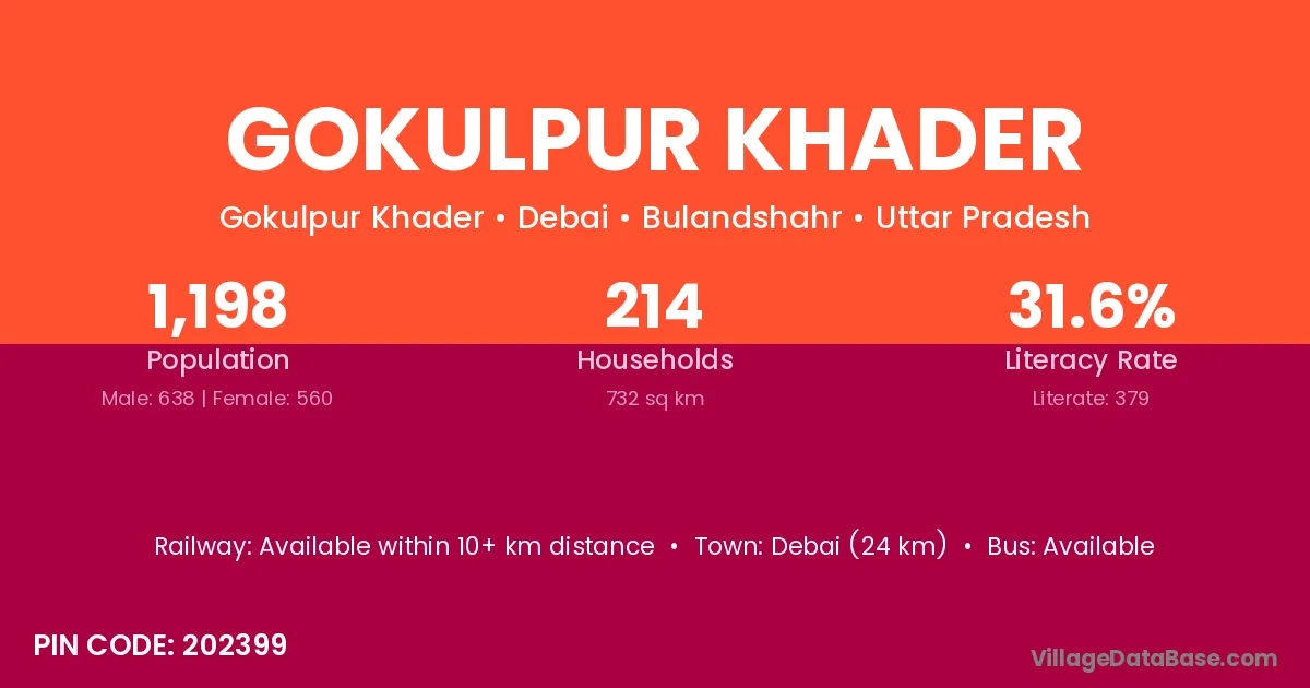 Debai (24 km) is the nearest town to Gokulpur Khader village for major economic activities and is located approximately 24 km away.