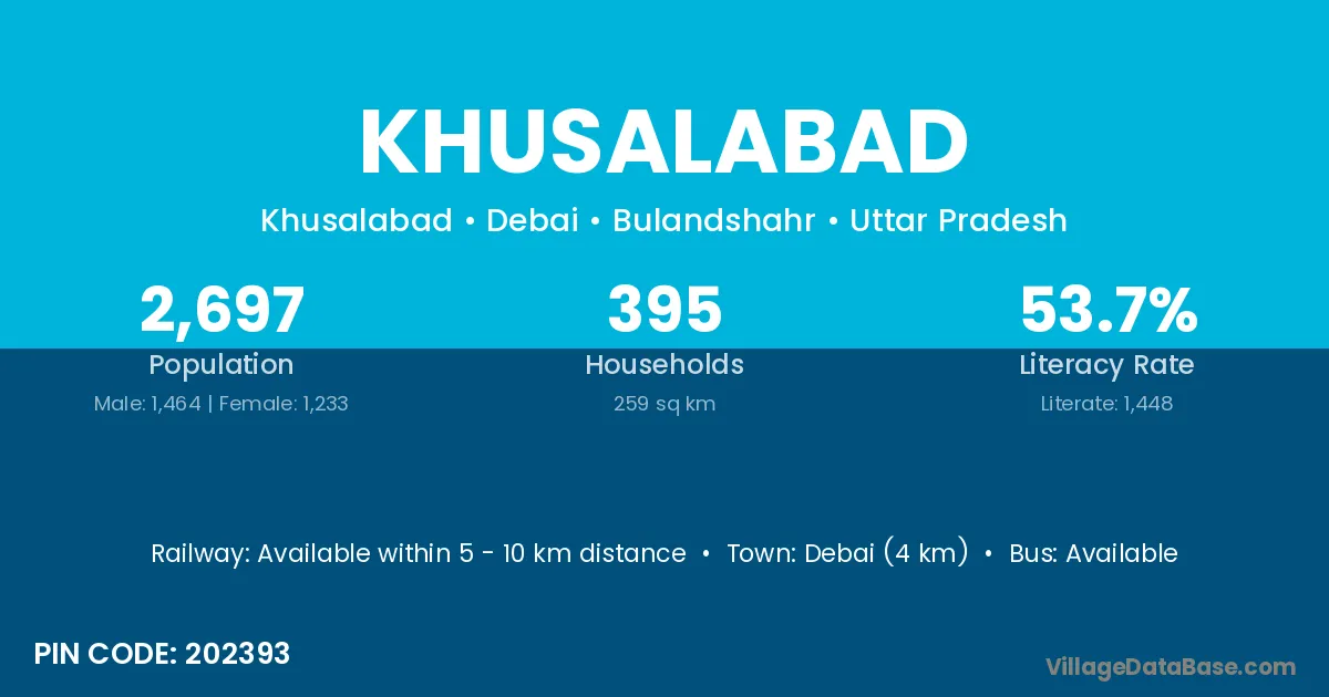 Debai (4 km) is the nearest town to Khusalabad village for major economic activities and is located approximately 4 km away.