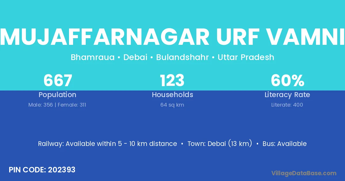 Mujaffarnagar Urf Vamni village has a total population of 667 people, of which 356 are males and 311 are females.