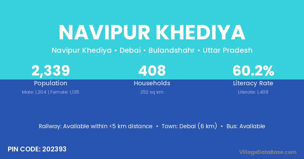 Debai (6 km) is the nearest town to Navipur Khediya village for major economic activities and is located approximately 6 km away.