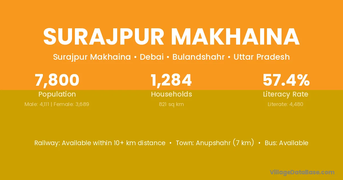 Anupshahr (7 km) is the nearest town to Surajpur Makhaina village for major economic activities and is located approximately 7 km away.