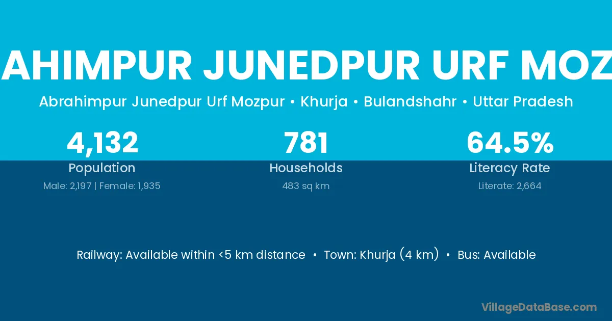 Khurja (4 km) is the nearest town to Abrahimpur Junedpur Urf Mozpur village for major economic activities and is located approximately 4 km away.