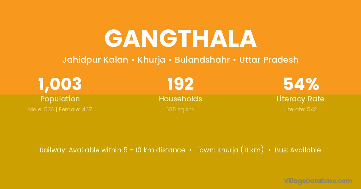 Khurja (11 km) is the nearest town to Gangthala village for major economic activities and is located approximately 11 km away.