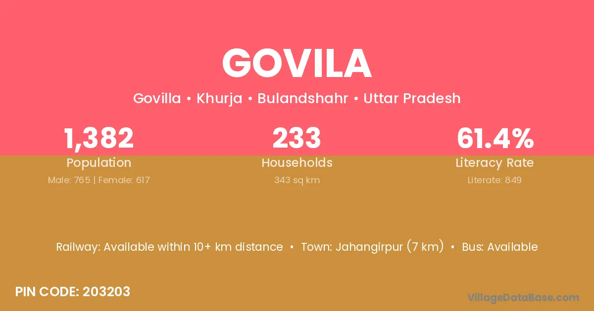 Jahangirpur (7 km) is the nearest town to Govila village for major economic activities and is located approximately 7 km away.