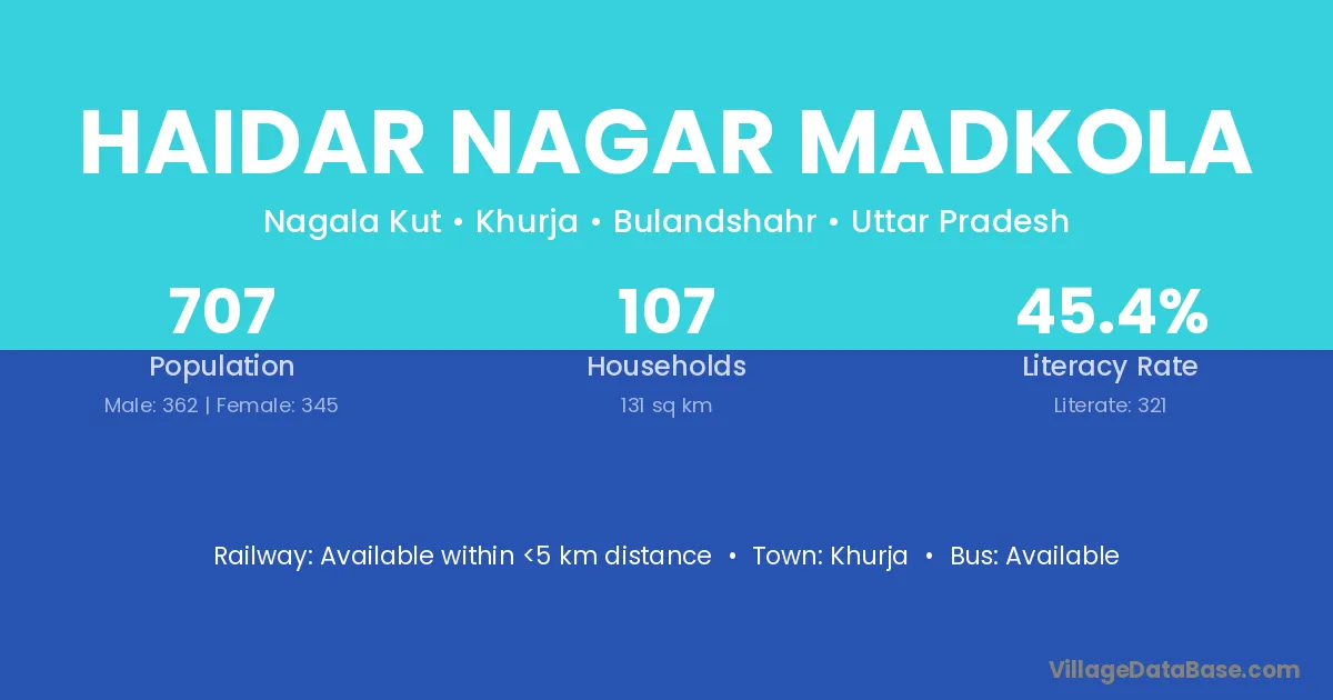 Haidar Nagar Madkola village has a total population of 707 people, of which 362 are males and 345 are females.