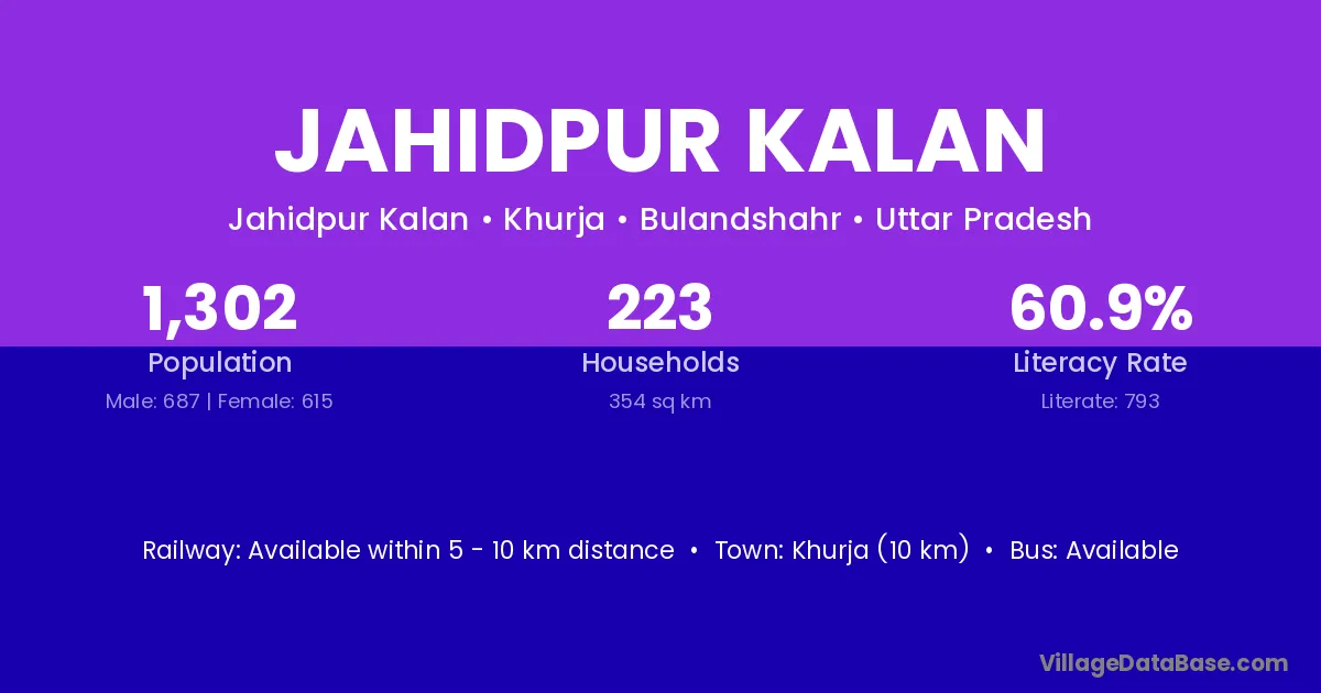 Khurja (10 km) is the nearest town to Jahidpur Kalan village for major economic activities and is located approximately 10 km away.