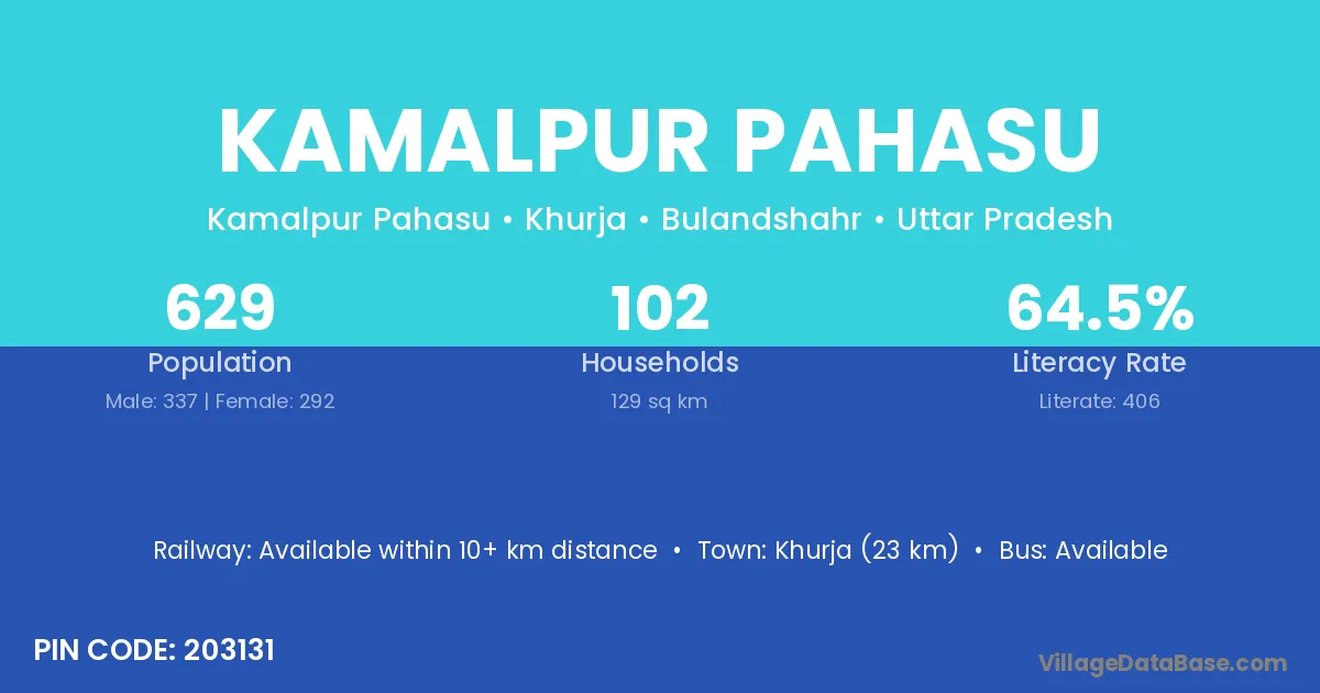 Khurja (23 km) is the nearest town to Kamalpur Pahasu village for major economic activities and is located approximately 23 km away.