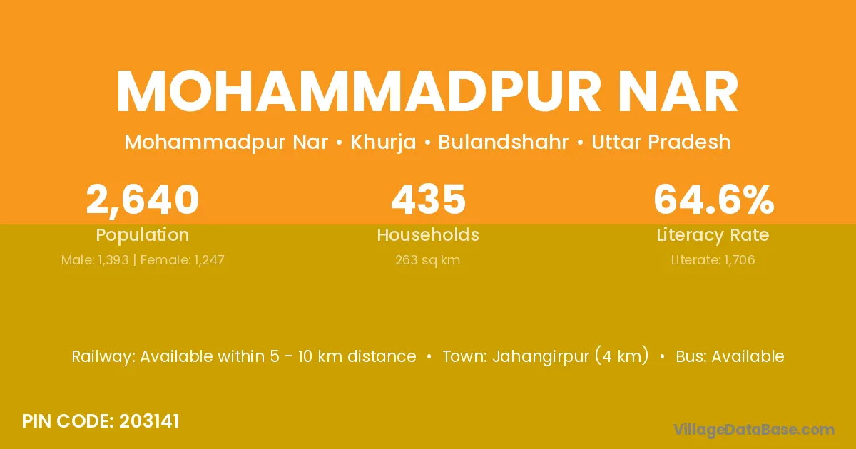 Jahangirpur (4 km) is the nearest town to Mohammadpur Nar village for major economic activities and is located approximately 4 km away.
