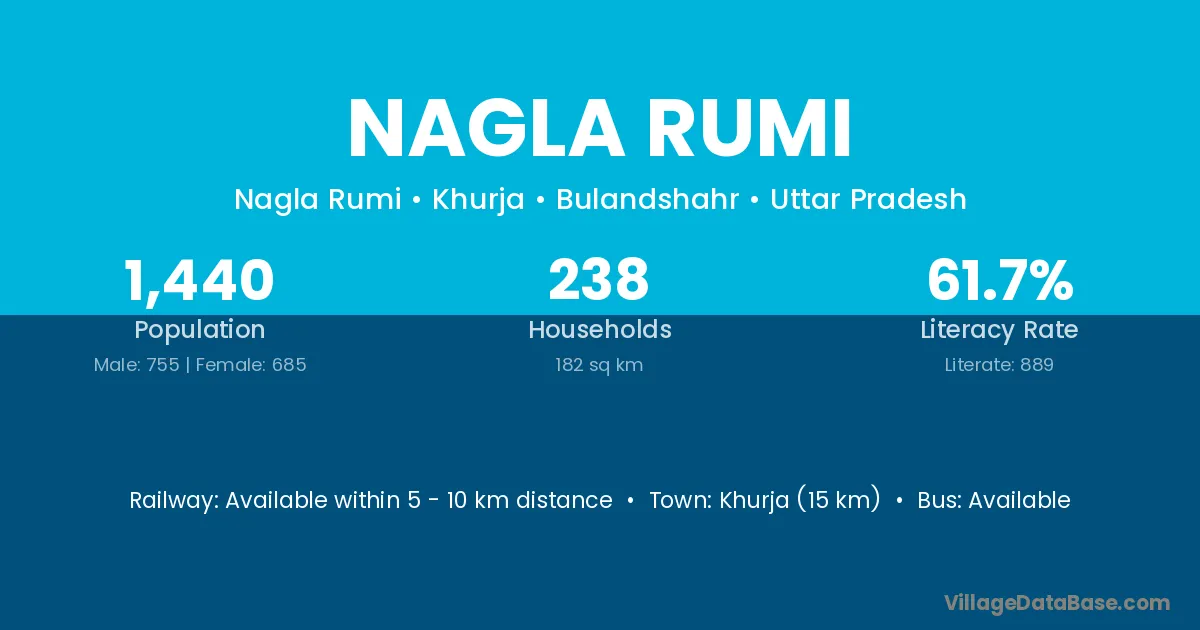 Khurja (15 km) is the nearest town to Nagla Rumi village for major economic activities and is located approximately 15 km away.
