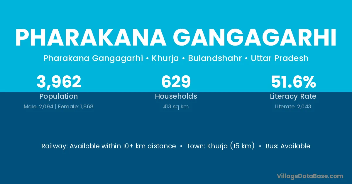 Khurja (15 km) is the nearest town to Pharakana Gangagarhi village for major economic activities and is located approximately 15 km away.