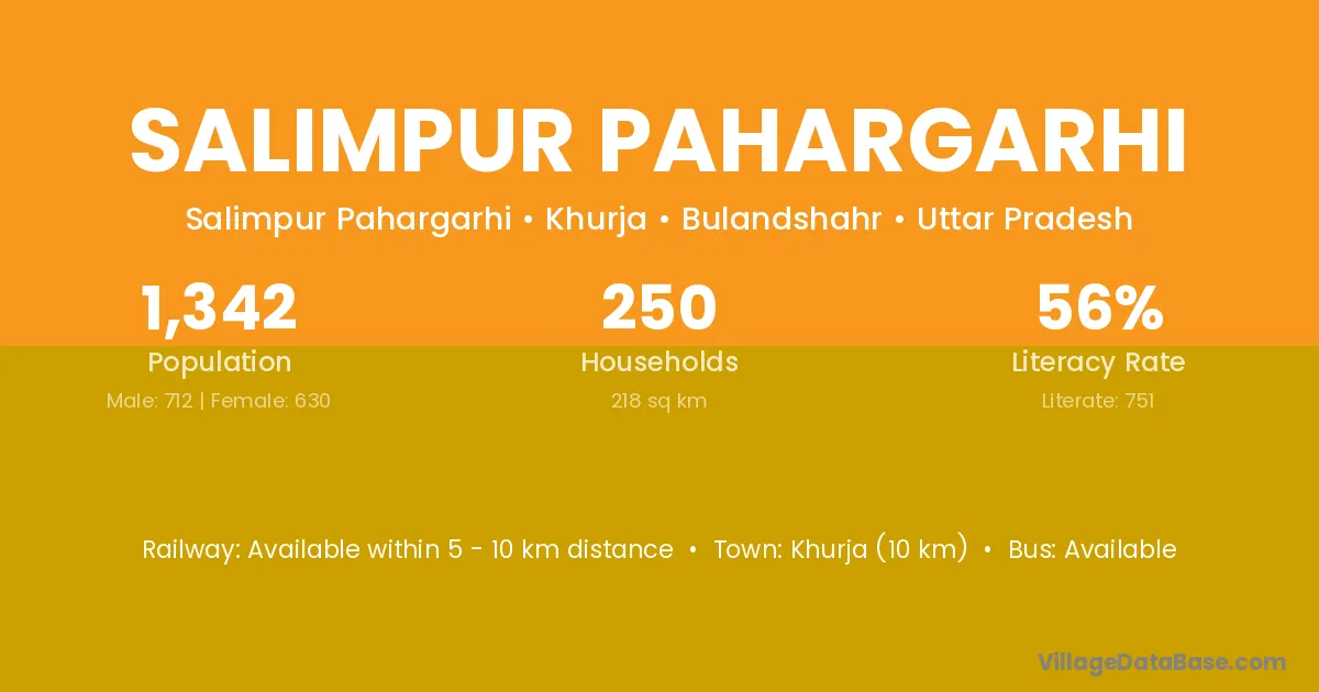 Khurja (10 km) is the nearest town to Salimpur Pahargarhi village for major economic activities and is located approximately 10 km away.