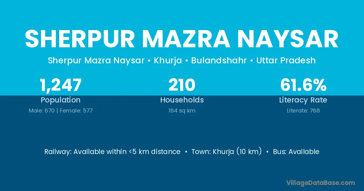 Khurja (10 km) is the nearest town to Sherpur Mazra Naysar village for major economic activities and is located approximately 10 km away.