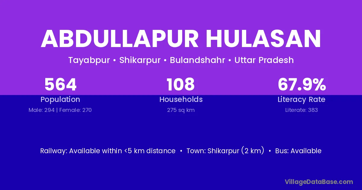Abdullapur Hulasan village has a total population of 564 people, of which 294 are males and 270 are females.